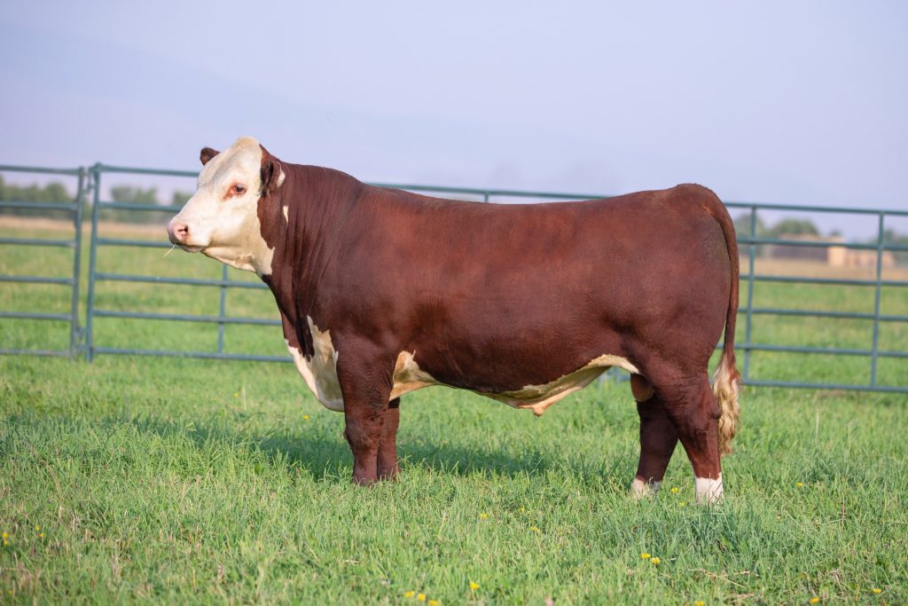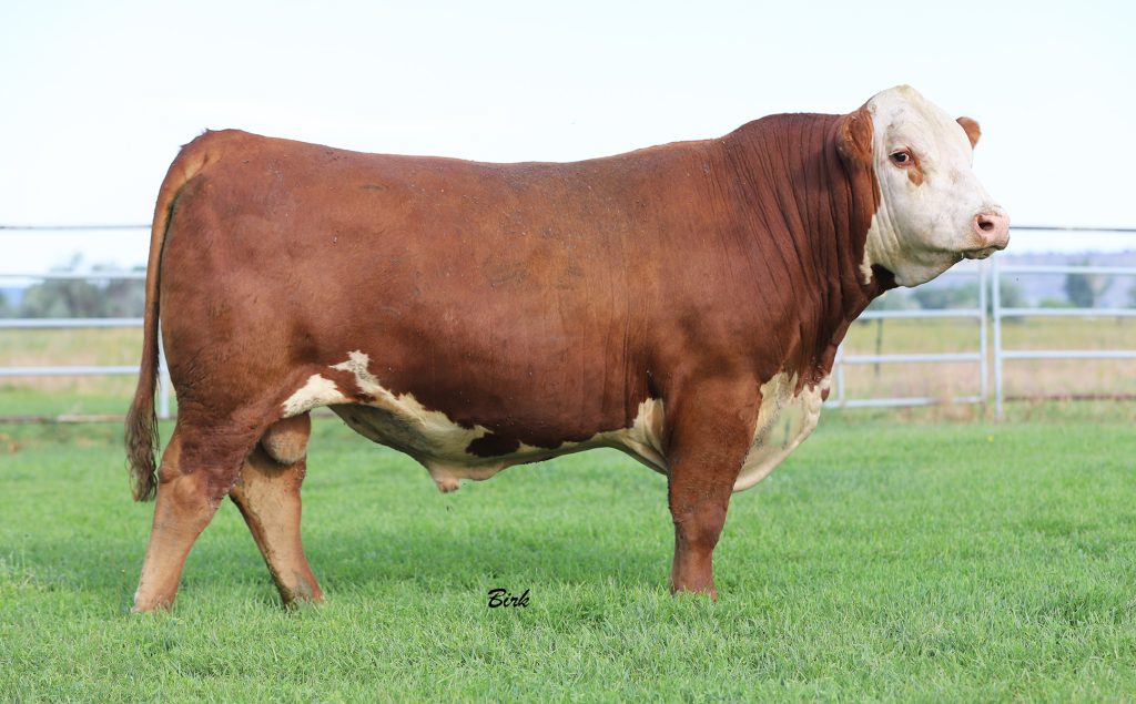 Sooth made, homozygous polled, Braxton 719 son that is backed by a very productive cow family. The maternal is bred into C009. His daughters in production are doing an amazing job. C09 is nicely pigmented and short marked; he will see continued use here. Structural soundness and calving ease are hallmarks of the Braxton line of cattle. Owned with Anchor Polled Herefords.